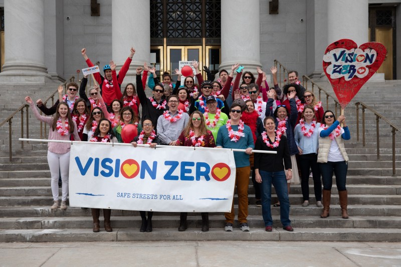 Street safety advocates praised the city for its commitment to Vision Zero with a Valentine’s Day “love-in” demonstration at City Hall yesterday. Photo: Andy Bosselman, Streetsblog.